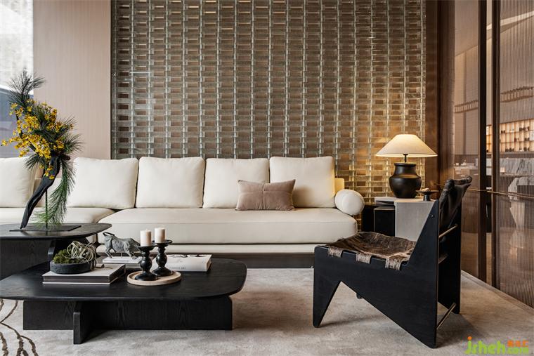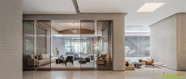 空間核心路徑環(huán)繞中央水池鋪陳,集中詮釋人與空間、人與自然、人與生活的關系。成都保利錦城和頌體驗中心裝修設計沒有復雜的造型與色彩,沒有繁瑣的材料與構造,精心組織的燈光有如天光灑落,與變化的自然光互補成為空間最生動的表情。為實現(xiàn)簡約明快的氛圍與細節(jié),設計師選擇如定制人造石、玻璃磚等特色材料完成表達。