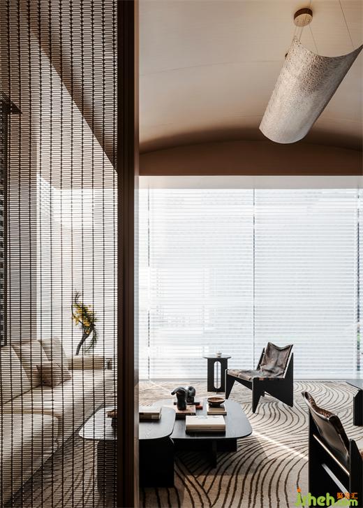 比風景更重要的,是看風景的角度。借鑒何陋軒的建筑手法,室內(nèi)大弧形天花里高外低,看向戶外的視線被刻意壓低,而人在步入空間之始會有豁然開朗之感。洽談區(qū)高低錯開,避免不同位置的視線遮擋,同時模糊里外空間界限。抬高區(qū)域將水景盡納目下,下沉區(qū)域親近水池,每當清晨霧氣氤氳,身臨其境恍若置身瑤池仙境。