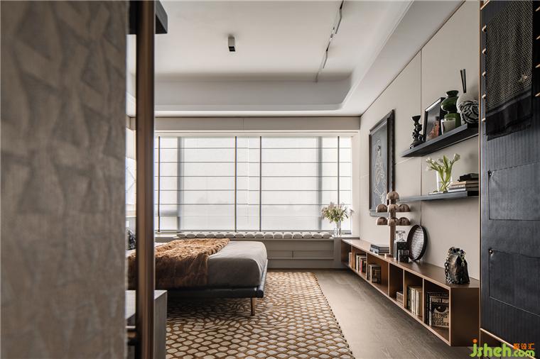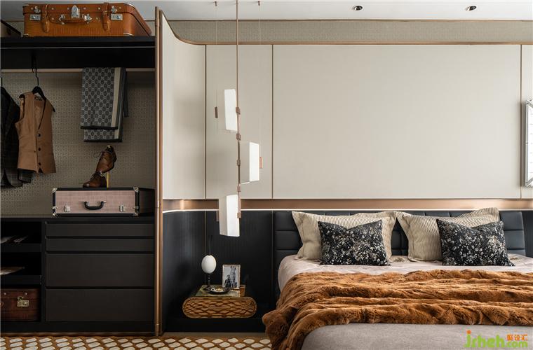 主臥的主要基調(diào),來源于公共空間中沉穩(wěn)低調(diào)的皮革棕色系,越秀樣板間設(shè)計(jì)通過少量黑色、金屬色、木色的調(diào)和,呈現(xiàn)出溫和優(yōu)雅的精英氣息,并與雜糅進(jìn)空間的松弛與詼諧情緒一起,完成對(duì)于個(gè)體審美的充分表達(dá)。