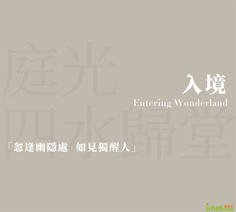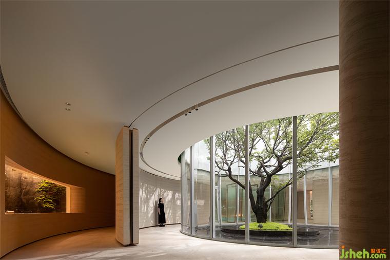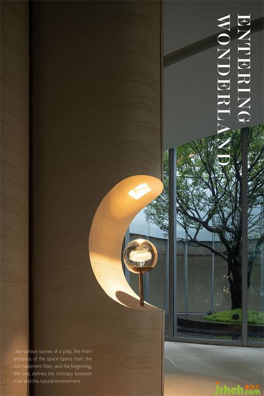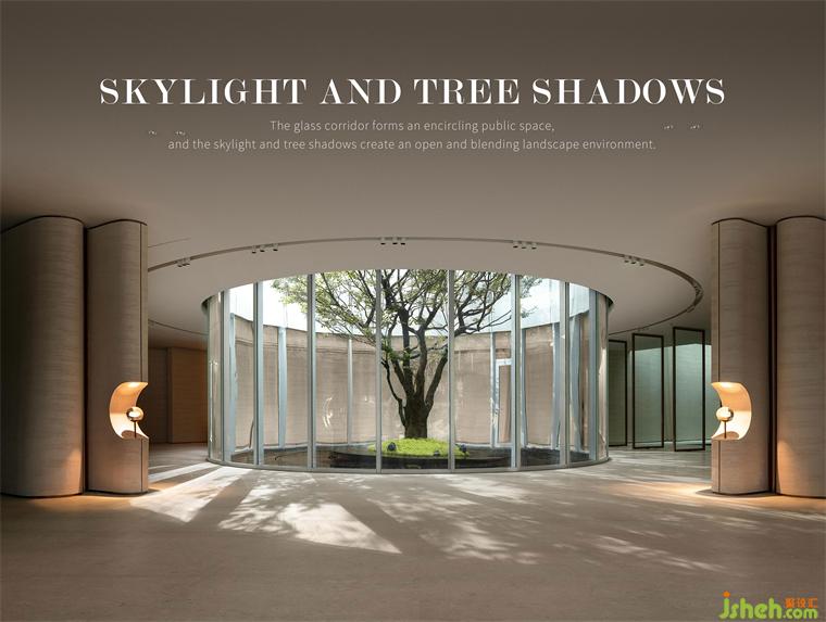 如一場(chǎng)劇幕,空間主入口自地下一層開(kāi)啟,初始,樹(shù),即定義了人與自然環(huán)境間的親疏。售樓處設(shè)計(jì)玻璃圍廊形成環(huán)繞的公共空間,天光與樹(shù)影創(chuàng)造一種開(kāi)放、互融的景觀環(huán)境。斑駁中,自然以一種具象化的形式呈現(xiàn)在人們眼前,環(huán)繞的汩汩水流象征四水歸堂。
