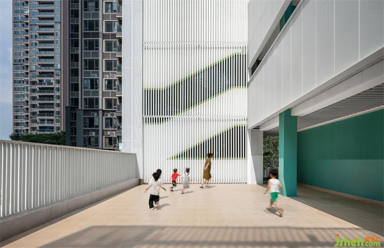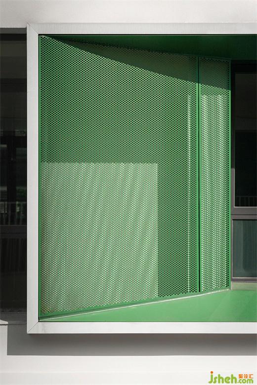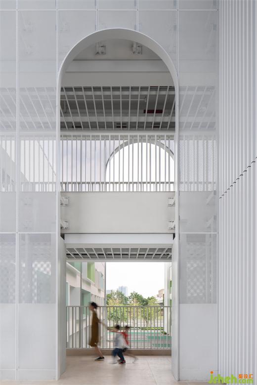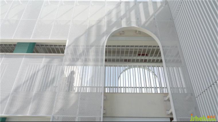 幼兒園設計金屬沖孔網(wǎng)如紗網(wǎng)一般,輕盈而具有呼吸感,既有效地遮蓋了原建筑結構的缺點,又因空隙過濾著光的形態(tài),捕捉著光影的變化,而金屬沖孔網(wǎng)上挖出的圓與橢圓的造型,則更進一步豐富了搖籃的具體形態(tài),并使之趣味盎然。