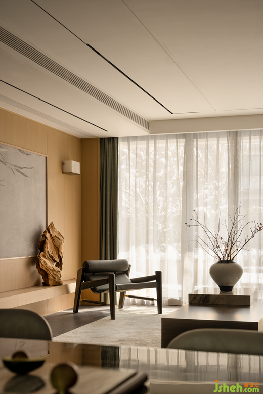 木色溫潤,格柵元素延續(xù),強(qiáng)化著空間整體的感受。下疊別墅設(shè)計傳統(tǒng)東方的表達(dá),在此進(jìn)入日常生活的層面,被轉(zhuǎn)化,被滲透,成為一種知而雅的底色,一種理想生活的影調(diào)。