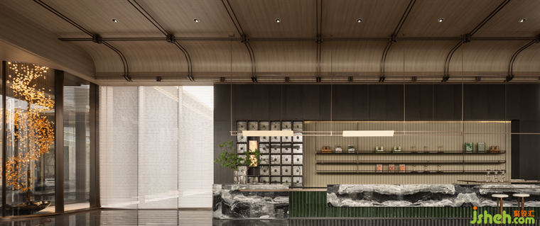 取自傳統(tǒng)建筑元素的斗拱結構,售樓處設計以金屬材質隨拱頂輪廓呈現(xiàn)。拱頂形態(tài)的提取與舊時商人會館或街道旁的涼棚呼應,結合前臺的石紋,在游走中為空間的儀式感定調。