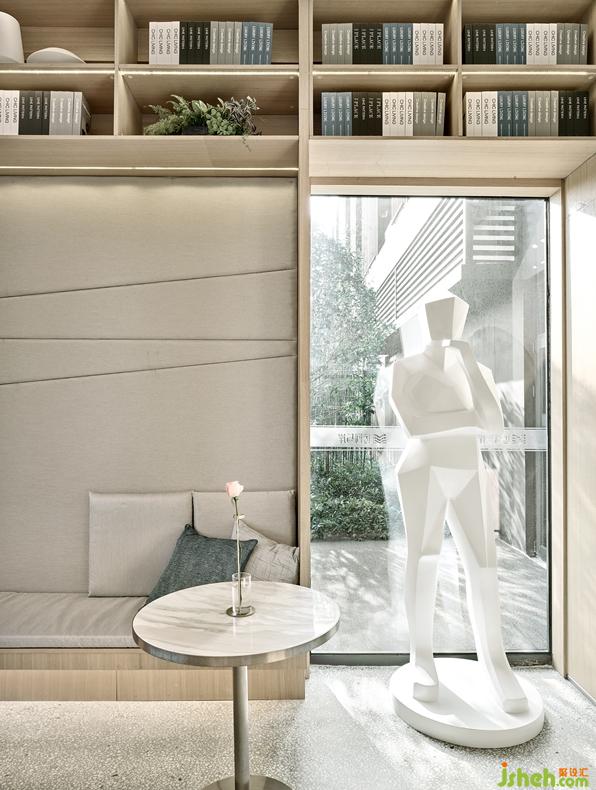 透過(guò)整面書(shū)柜,是用于洽談的下沉區(qū)書(shū)吧。半包圍區(qū)域以柔和的木質(zhì)為基調(diào),環(huán)繞著來(lái)自TASCHEN出版社的讀物,星空頂?shù)脑O(shè)計(jì)將空間從單調(diào)的紋理中抽離出來(lái),顯得輕巧而生動(dòng),給閱讀與洽談增添一絲活躍的氣氛。