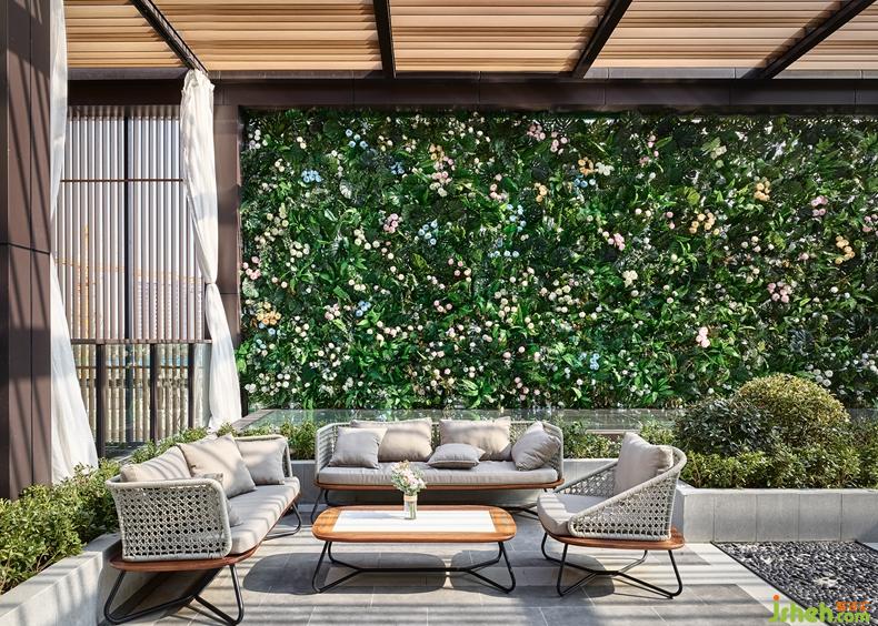 進入二層映入眼簾的是通透溫馨的太太廚房,長條的開放式操作臺便于烘焙與交流,使整個空間互動且活潑。半透明墻面上的女性形象涂鴉充滿活力,張揚且突出主題,簡潔的線條配合花卉裝飾,給予當代女性全面的詮釋和表達。走出戶外,一片生機盎然的景象是野獸派花園的陳列。這個半開放式空間由遮陽頂與紗簾為邊線,戶外沙發(fā)套組的背后是一整面花草墻,與三五好友在此喝個下午茶聊聊天,雅致而沁心。
