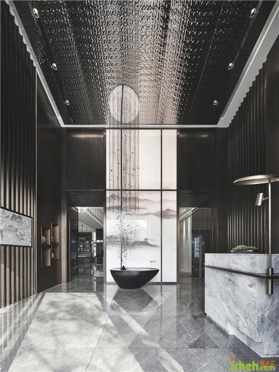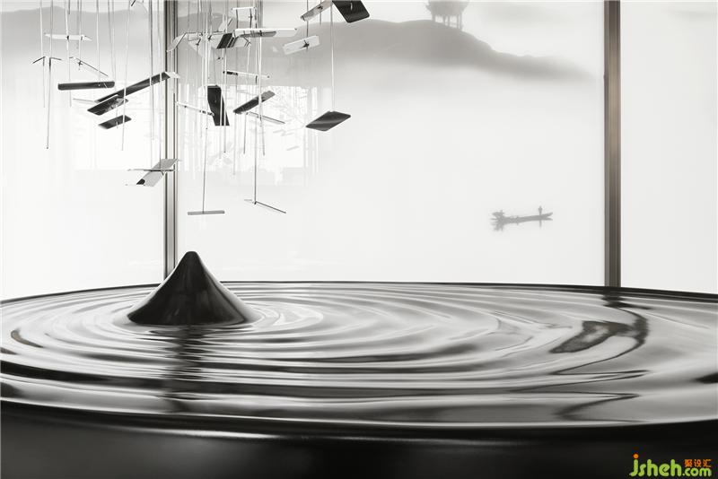 超白夾絹玻璃映襯出一幅“浮萍破處見山影,小艇歸時(shí)聞草聲”的悠然畫卷。光線從吊頂波紋不銹鋼的邊緣沿線條垂流而下,凝固在水滴漣漪的藝術(shù)裝置上,使人走入其間,如與自然共棲,相得益彰。會(huì)所設(shè)計(jì)