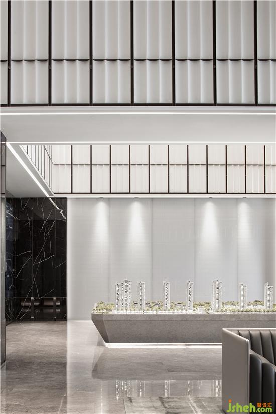 從門廳至洽談區(qū),沙盤落在空間之中,整個(gè)沙盤區(qū)線條簡(jiǎn)潔,層次分明,突出了運(yùn)河旁多樣住宅形制的樓盤特點(diǎn),簡(jiǎn)明意賅。