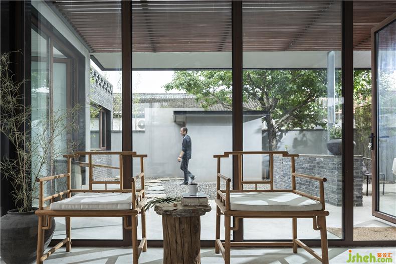 為了實現(xiàn)庭院視覺的穿透性和連貫性,建筑師以大面積玻璃作為首層南北立面的主要材料,置身室內(nèi),可觀春華秋實、晨昏霧靄,聽雨打石板地的清脆聲響,讓自然風光成為生活風景。而這種開放又與院外相隔,充分保障了居住空間的私密性,室內(nèi)設計師這也是對傳統(tǒng)民居內(nèi)向性審美的一種延續(xù)。