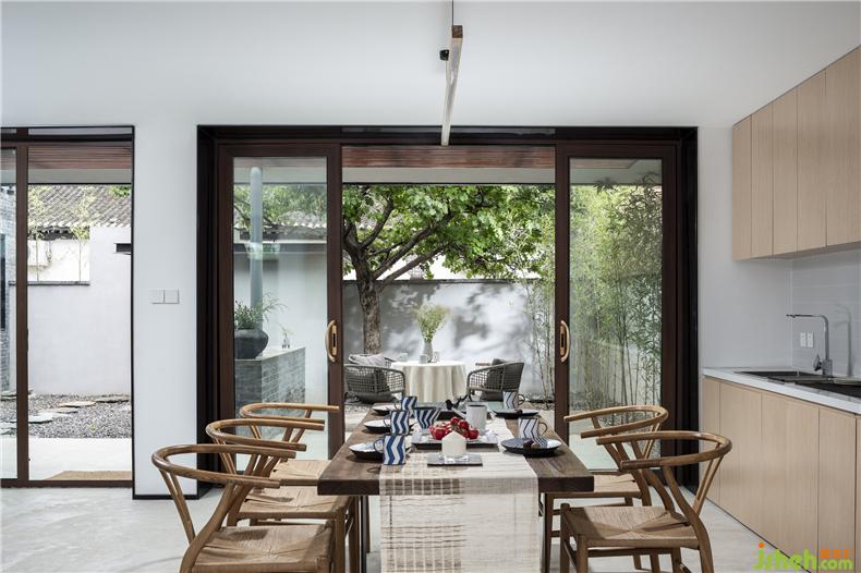為保障戶外活動無懼陰雨和暴曬,建筑在南向設(shè)置了玻璃雨棚,并以木格柵形成光線的過濾。室內(nèi)設(shè)計師同時,灰空間的留存是對傳統(tǒng)建筑形制“風(fēng)雨連廊”的追憶,兼具功能和情感價值。