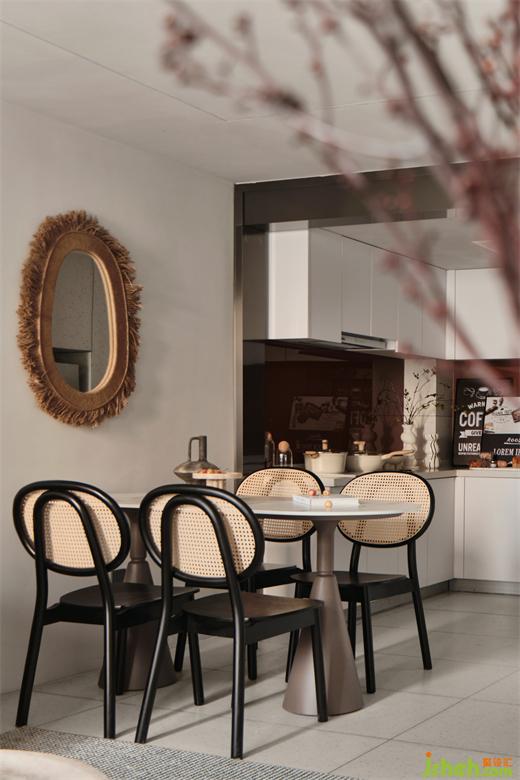 與家人享受一餐飯的相聚,家的溫度也在這種親近中慢慢升溫.在就餐場景的營造中,民宿裝修設(shè)計(jì)通過冷暖材質(zhì)的對(duì)撞,奇妙的反差感為就餐增加了豐富的趣味性.小體量空間中的功能復(fù)合,通過使用場景交叉來豐富體驗(yàn)感受.