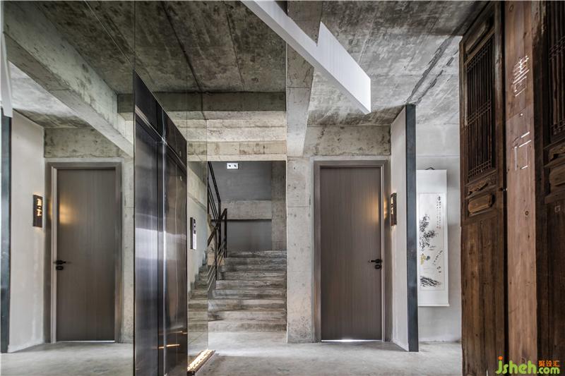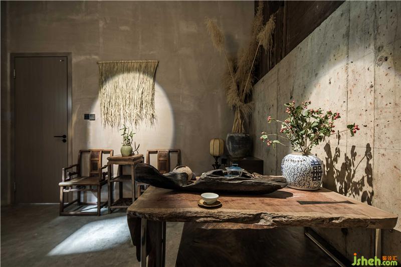 簡約是大堂的調(diào)性,進門左側瓶中放置蘆葦插飾,休息區(qū)以沙漏狀黑色矮凳標識出來,配合充滿懷舊氣息的銅壺和茶碗意境十足。點睛之筆是墻上交錯對仗的黑色置物格里的茶葉罐。意為以茶會友,左右以建筑豎中軸線為分割,劃分成不同的功能區(qū)。玻璃外立面與“心·谷”生態(tài)缸相呼應,自然光由外入內(nèi),形成更加通透的空間視覺。休息區(qū)面對接待臺,陳舊的老樹木根年代感十足,環(huán)繞臺前。電梯左側墻面的金屬鏡面反射裝飾陳設,擴大了視覺面積。不規(guī)則條狀燈掩蓋吊頂?shù)目瞻?,輝映其中。婉約的茶師佳人素手制茶,質感十足的銅壺煮開沸水,澆灌至蜷縮的茶葉上便茶香四溢,香煙裊裊,思緒像是飄至遠山,輕松自在,悠然愜意。