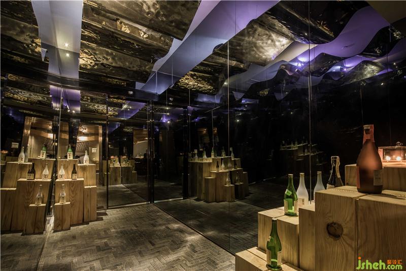 原有空間的狹長過道通過鏡面不銹鋼光反射的原理,擴大了視覺上的空間效果,凹凸起伏的鋼面吊頂猶如波浪般蕩漾,加以紫色的燈光科技感十足,亦充分利用空間成為酒品展出的最佳位置,契合設(shè)計美感與實用性。餐廳裝修設(shè)計