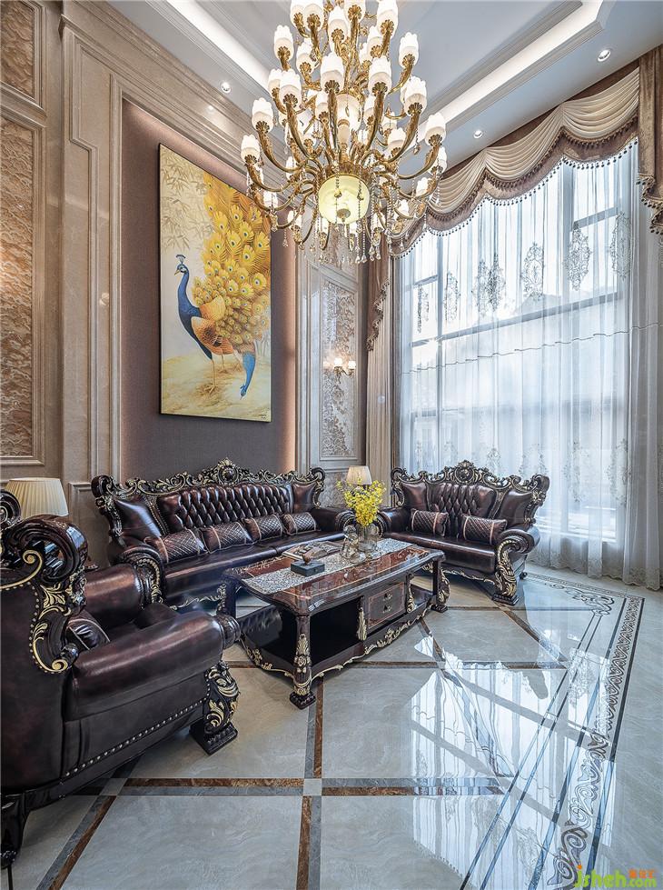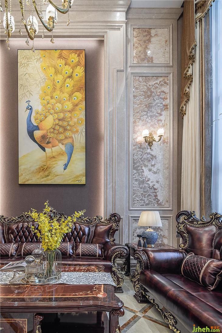 材質(zhì)運(yùn)用上,同色系軟包背景墻銜接大面積的石材墻面,延展空間尺度的同時(shí),充滿轉(zhuǎn)折的美感。深褐色的沙發(fā)擺放在一幅孔雀掛畫(huà)前,整個(gè)空間的色彩層次豐富明朗。