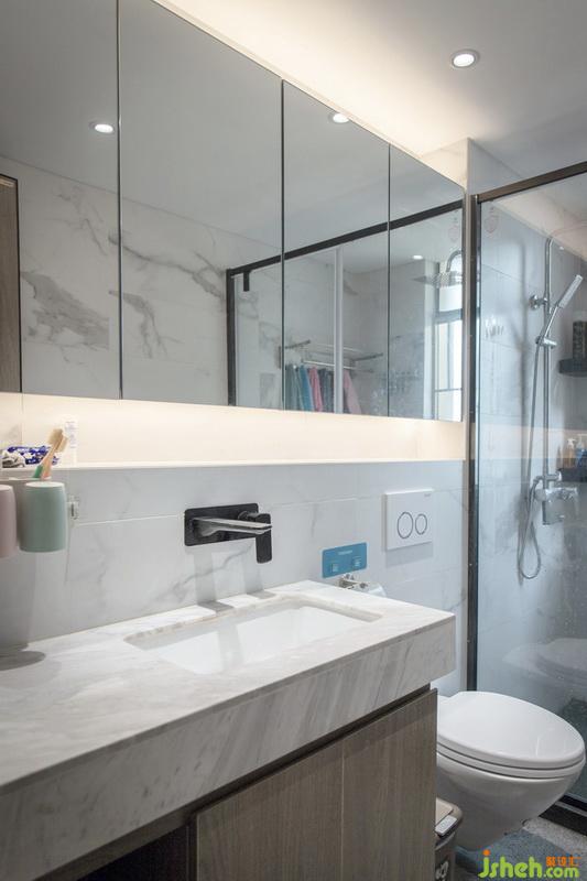 戶主夫婦都喜愛親自下廚,設(shè)計(jì)以上白下木為廚柜主調(diào),配上透明玻璃廚房門,增加內(nèi)外通透感。