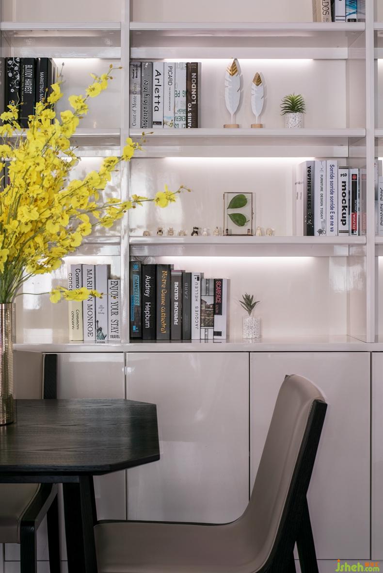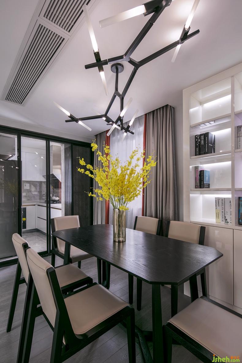 透過一扇落地玻璃的隔斷,是選自木制餐桌的樸質(zhì)生活。線條感的燈飾、亞麻色的窗簾與客廳、廚房的設(shè)計(jì)相互輝映。室內(nèi)設(shè)計(jì)師餐邊柜設(shè)計(jì)為到頂?shù)难b飾收納柜,內(nèi)嵌燈條的光線讓收藏的飾物更有展現(xiàn)視覺效果。