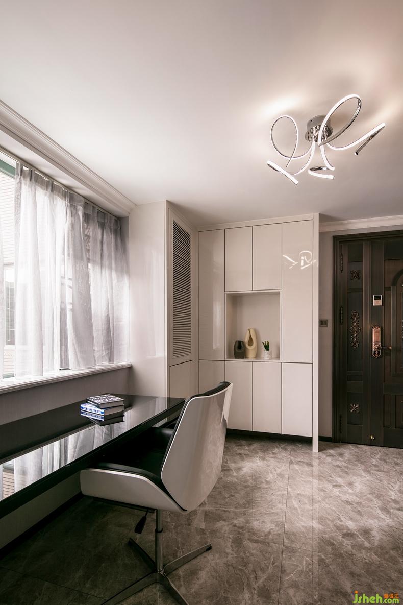 將入門的玄關(guān)空間同時(shí)劃分出閱讀工作的區(qū)域,書桌直接面向一扇接近兩米的窗戶,敞亮溫暖的陽光滲入,無疑是學(xué)習(xí)工作最好的區(qū)域,而別致線條的燈飾更是這個(gè)空間的一處亮點(diǎn)。