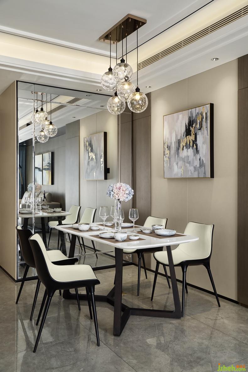 餐廳一角的設(shè)計(jì),采用了整體鏡面處理的墻面,透過折射的視線使整個(gè)空間展現(xiàn)得寬敞、明亮。水晶燈下雪花白的簡易幾何餐桌,室內(nèi)設(shè)計(jì)師搭配一側(cè)優(yōu)雅的掛畫,體現(xiàn)著主人家對生活的精致追求。