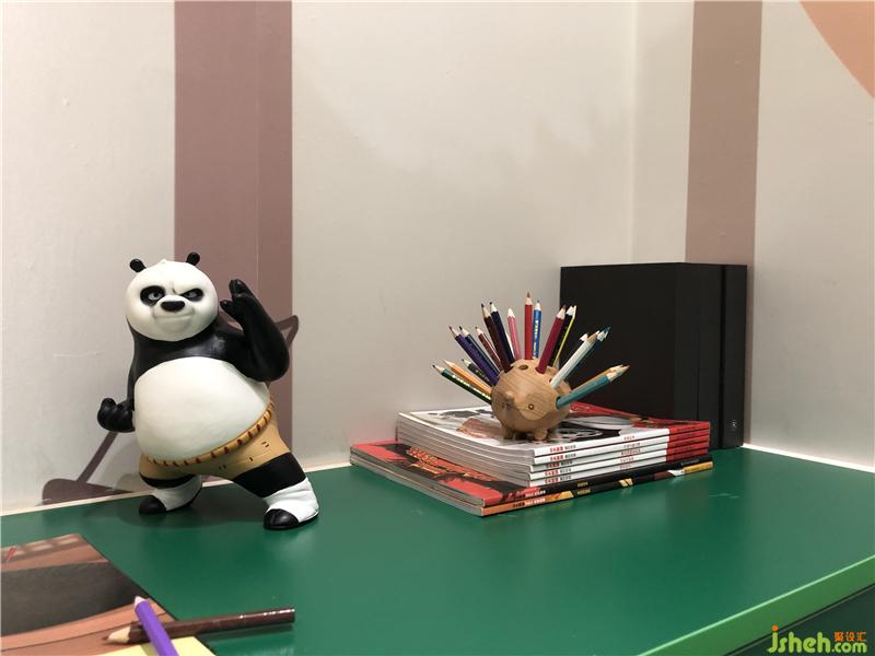 兒童房將童趣進行到底,可愛的熊抱玩偶與功夫熊抱擺件,還有墻上的熊貓裝飾畫,讓整個樣板房設計房間充滿萌趣。黃與綠的大膽撞色,營造出童話般的小小世界。