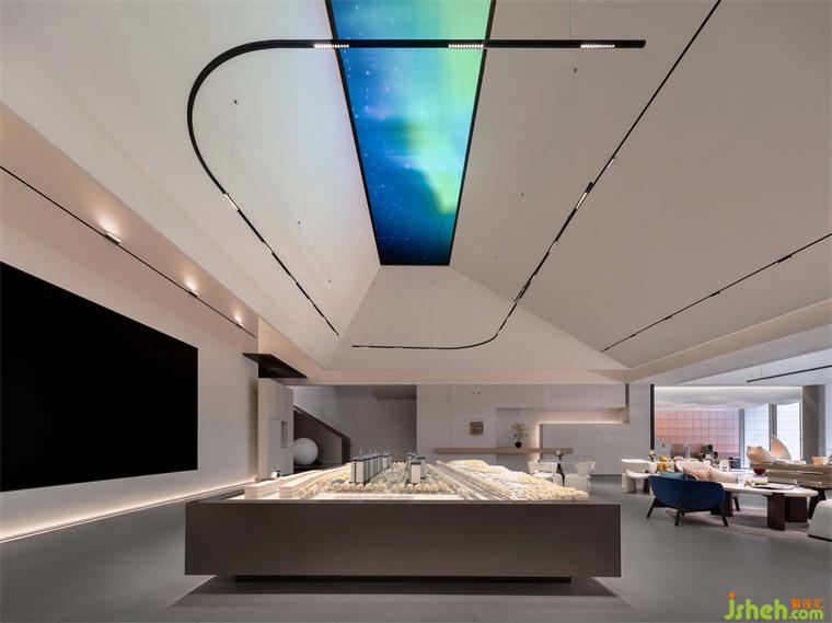 沙盤區(qū)頂部采用茅屋的梯形結(jié)構(gòu),模擬鏤空效果,體現(xiàn)出傳統(tǒng)建筑的美學(xué)特點(diǎn),讓空間結(jié)構(gòu)看起來(lái)更加輕盈和自由。銷售中心設(shè)計(jì)垂落的燈帶豐富空間的層次感,不再局限于傳統(tǒng)售樓處的展示模式,而是以一種更為靈活且富有創(chuàng)意的方式呈現(xiàn)。