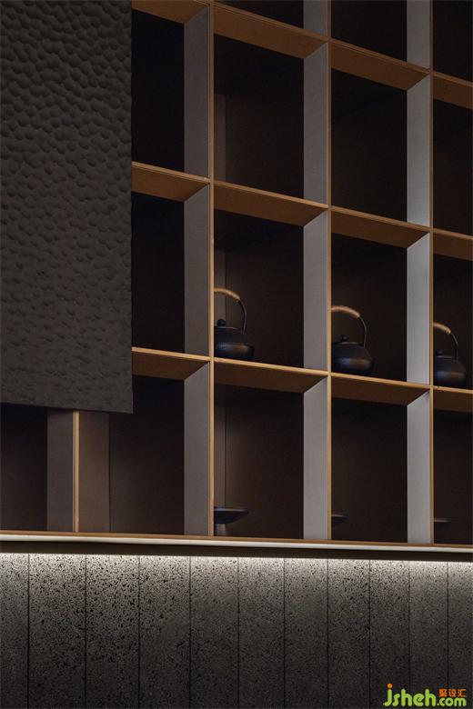 水吧臺(tái)處,茶道與品茗文化彌漫其中,營(yíng)造“竹下忘言對(duì)紫茶,全勝羽客醉流霞”的風(fēng)雅氛圍,構(gòu)建出以姑蘇在地文化為基礎(chǔ)的獨(dú)特場(chǎng)域,融入現(xiàn)代審美觀念,使整個(gè)空間彌漫著東方韻味。深沉色調(diào)的水吧臺(tái)搭配井字格陳列柜,在滿足功能性的同時(shí),也為人們營(yíng)造了一個(gè)品味生活、體驗(yàn)藝術(shù)的空間。