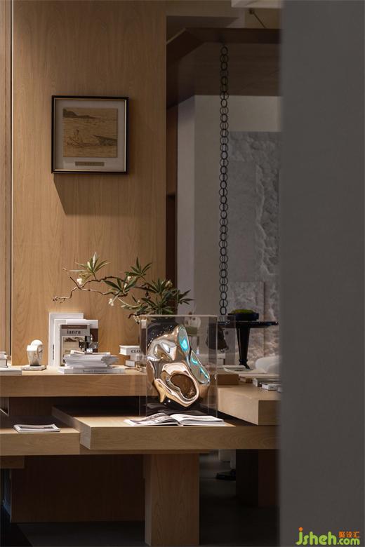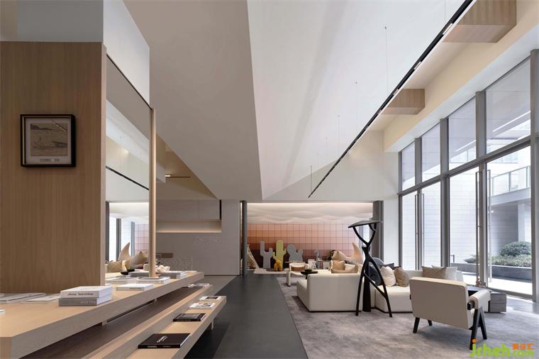 在邊界處外露部分建筑梁體,保留梁的原始質(zhì)感和體塊感,增強(qiáng)空間的藝術(shù)性。參差錯(cuò)落的板塊構(gòu)成了人文藝術(shù)與水墨書(shū)卷的展示區(qū),銷(xiāo)售中心設(shè)計(jì)將傳承的國(guó)學(xué)與現(xiàn)代藝術(shù)相結(jié)合,在洽談區(qū)演繹出一種別樣的文化韻味。
