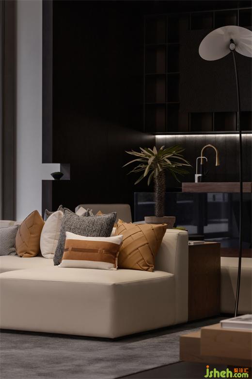柔軟舒適的皮質(zhì)沙發(fā),伴隨著悠揚(yáng)的音樂(lè),讓人感受到一種愜意的生活節(jié)奏。一側(cè)的藝術(shù)裝置采用質(zhì)感鮮明的巖石板,自然舒展的紋理,仿佛在訴說(shuō)著歲月的滄桑和空間的無(wú)限寬廣。