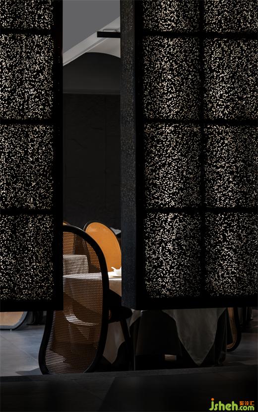 粵餐館設(shè)計(jì)師希望為現(xiàn)代都市人群打造一處別具一格的新場(chǎng)域,讓他們機(jī)會(huì)與自然遇見(jiàn)、與人遇見(jiàn),雖置于匆忙的都市間,在步入序廳的那一刻,就有了抽離感。透過(guò)現(xiàn)代藝術(shù)的設(shè)計(jì)手法,將東方文化的核心精神融于空間,營(yíng)造一個(gè)“近者欣喜,遠(yuǎn)者向往”的就餐環(huán)境。