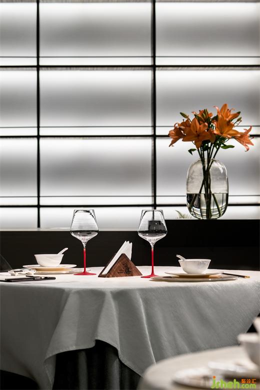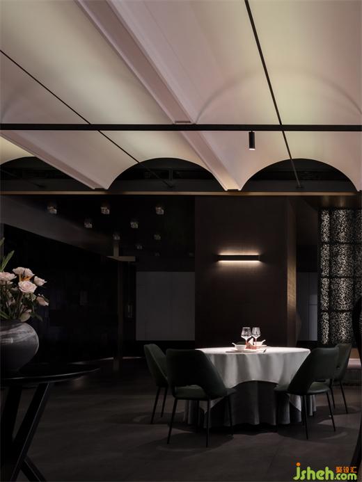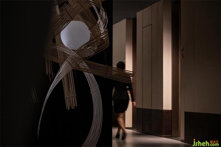 粵餐館設計開放的公共用餐區(qū)和包廂區(qū)在中廳處兩側(cè)分流,兩個區(qū)域間保持了一定的距離感?;诮ㄖ臻g的基礎,在南側(cè)的采光面設置包廂,在進入包廂前的廊道內(nèi)刻意做了流線的轉(zhuǎn)換,巧妙地在轉(zhuǎn)換點位上布置藝術裝置,喚起人們對形態(tài)美學和材質(zhì)美學的重新審視。