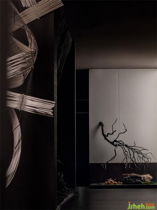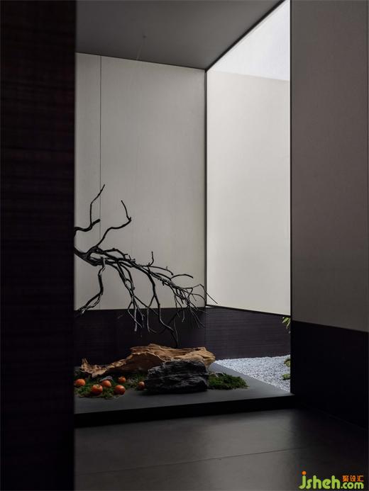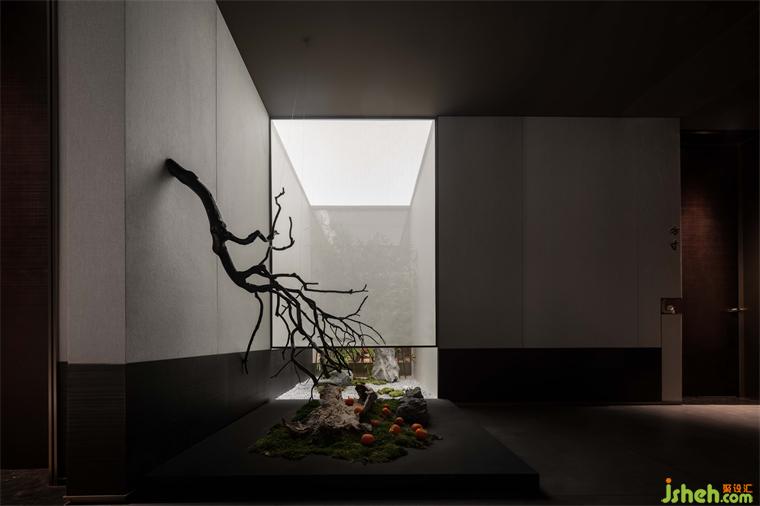 借月光的純粹洗凈一身塵埃,借花木的寬容撫平心靈的褶皺。枯枝自墻體蔓延而出,與底部的景觀裝置組合,與天井處傾灑下的光線交匯、重疊,在黑與白的強烈對比下,形成獨具東方風韻的一隅。