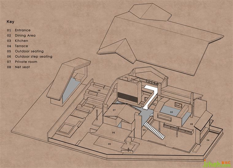 迭代設(shè)計展現(xiàn)了社區(qū)關(guān)系錯位的變形,以空間幾何為前提,街巷尺度和院落關(guān)系引導(dǎo)了設(shè)計進一步的發(fā)展。這種設(shè)計思路轉(zhuǎn)化為平面的表現(xiàn),體現(xiàn)為一系列院落、室內(nèi)、走廊的變形。餐廳設(shè)計多邊形幾何體系構(gòu)成了內(nèi)建筑的尺度系統(tǒng),而步道則將戶外空間的室內(nèi)、階梯和轉(zhuǎn)角連接起來,豐富了其空間效果,與社交性相得益彰。