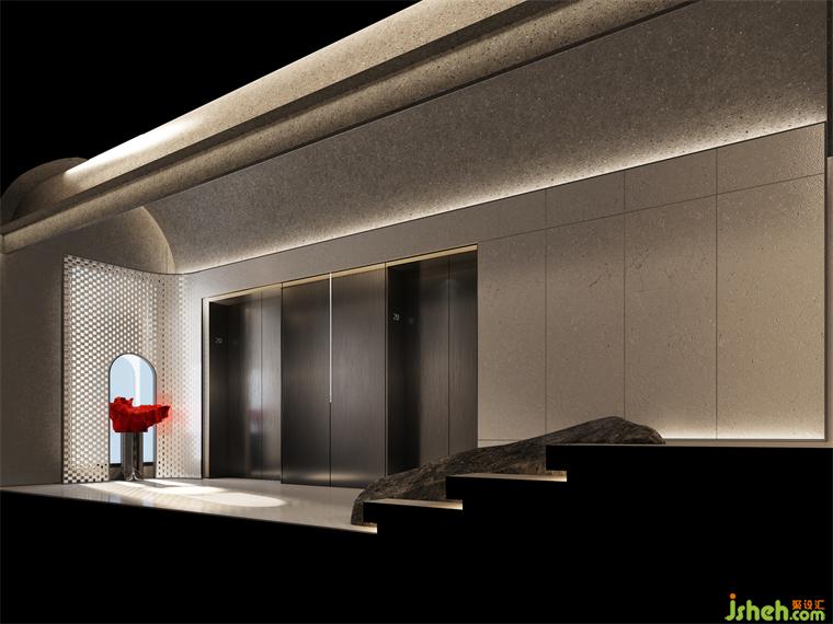 所以整個電梯空間仿佛柔軟、抽象的雙手抱護,隱喻朋友心中構(gòu)建的自我宇宙,別墅裝飾紅色湖石代表內(nèi)心中的錦繡與窗外現(xiàn)實中的山水形成對映。