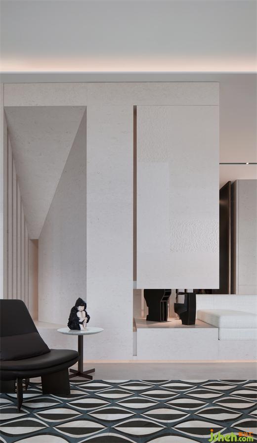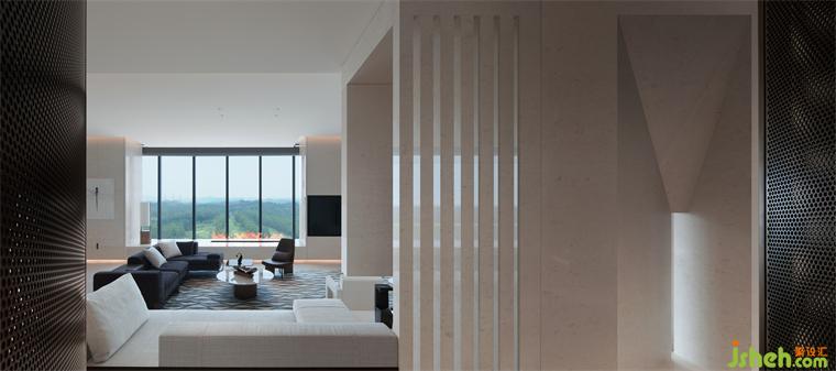 空間設(shè)計(jì)上的巧妙之處在于會(huì)客廳雖然有極具氣度的長(zhǎng)向尺度,但寬度因巨柱的位置限制而顯得拘促。走廊的抬高以及通往會(huì)客廳的臺(tái)階,別墅裝飾消解了柱子在空間中的存在,并且階梯上嵌入的沙發(fā)擴(kuò)大了會(huì)客廳的進(jìn)深,同時(shí)營(yíng)造了俯瞰的感受。