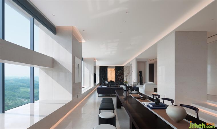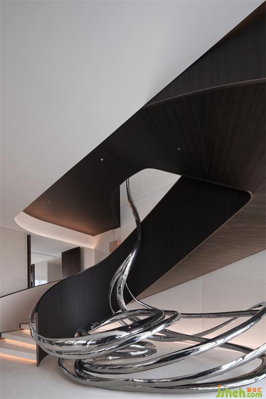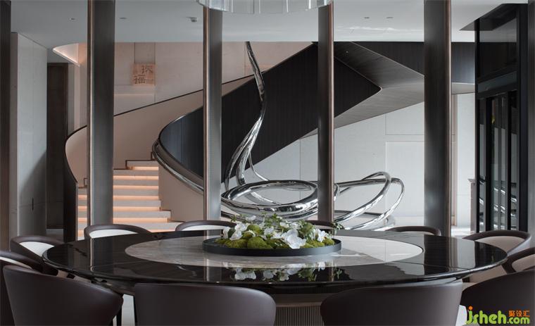 餐廳和樓梯之間用轉軸網眼銅屏風間隔,開合之間,氣象森然。別墅裝飾大型雕塑與樓梯融為一體,名扶搖,取意李白唐詩-大鵬一日同風起,扶搖直上九萬里。我問朋友,消隱于市是一和恒持的心境,待機扶搖也是吧?朋友笑而不語。