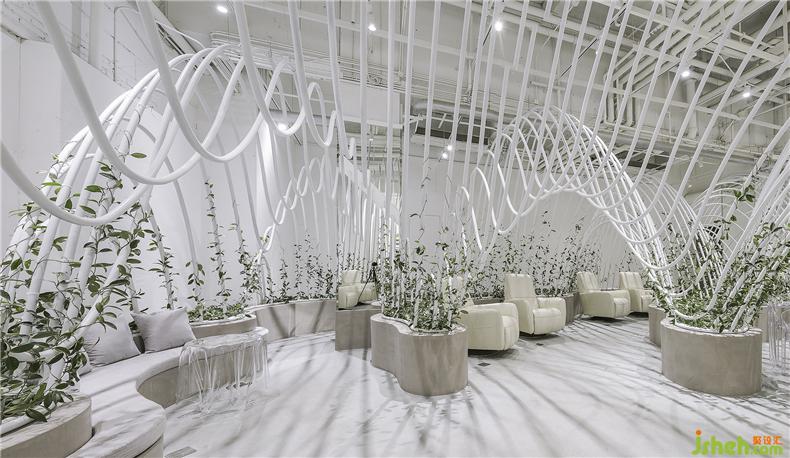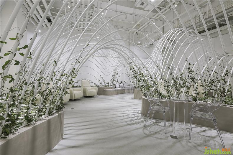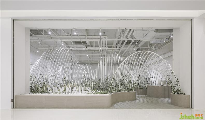 設(shè)計首先將整體空間劃分為公共和私密兩部分。室內(nèi)設(shè)計師公共部分為開放植物園。根據(jù)接待、等候、美甲、活動等功能生成10個大小不一的“山丘”,“山丘”互相聯(lián)通形成開放流動的路徑,使用直徑32mm、壁厚3mm的白色鍍鋅鋼管勾勒出連綿起伏的“山丘”輪廓,從地面升起的550mm高水泥臺,將抽象的“山丘”輪廓放置其上,沿水泥臺四周布置爬藤植物,室內(nèi)設(shè)計師綠色的球蘭藤蔓沿著“山丘”的輪廓線生長,生機盎然的提醒著時間和空間的變化。