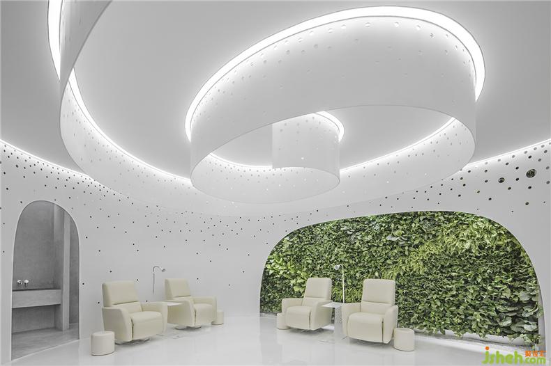 設(shè)計(jì)摒棄了以往該類型店鋪所采用的過(guò)度裝飾的符號(hào)化做法,室內(nèi)設(shè)計(jì)師以營(yíng)造輕松、舒適、自然的環(huán)境體驗(yàn)作為出發(fā)點(diǎn),讓顧客們?cè)谶@里可以放松身心,仿佛置身于一座花園。室內(nèi)設(shè)計(jì)師一圈兒8毫米厚的白色穿孔鋼板從商場(chǎng)走廊逐漸延伸至店鋪內(nèi)部,創(chuàng)造出一個(gè)柔軟、純凈的弧型空間。不同于以往美甲店排座的方式,室內(nèi)設(shè)計(jì)師這里的六個(gè)座位是向心排布的,顧客在美甲的同時(shí)也可以愉快的交流。LED發(fā)光燈膜結(jié)合螺旋鋼板,營(yíng)造出柔和均勻的室內(nèi)光環(huán)境。室內(nèi)設(shè)計(jì)師植物墻作為整個(gè)空間的綠色背景,使新空間富于生機(jī)。螺旋曲線與原有方形店鋪的空隙自然形成了前臺(tái)展示、植物景觀和員工服務(wù)等輔助空間。