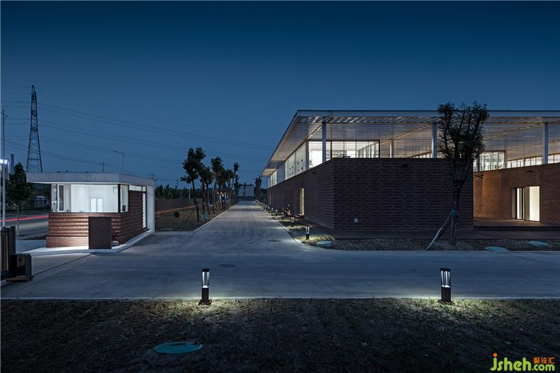 建筑在材料使用上較為克制,注重材料與空間的邏輯關(guān)系、辦公室設(shè)計內(nèi)外的一體化以及材料語言自身的表現(xiàn)力。建筑的前廣場、首層外墻和二層樓面均使用了紅磚這一該地區(qū)歷史建筑較為典型的材料,結(jié)合辦公樓建筑形態(tài)構(gòu)成了由南向北連續(xù)起伏的磚肌理地表。紅磚的砌筑方式與所在位置、開口方式、功能要求密切相關(guān),并在磚地表的不同區(qū)域產(chǎn)生凹凸、錯疊、滲透等的變化。在磚盒子界面之間,室內(nèi)外連橋、樓梯、門窗框以及部分室內(nèi)臺面等均采用鋼板材料,部分室外地面還做了防滑處理。辦公室設(shè)計磚盒子的內(nèi)部被處理為統(tǒng)一的淺色背景,使用了水磨石、涂料等。在磚盒子之上,二層空間內(nèi)外均使用穿孔鋁制格柵吊頂,照明、空調(diào)、設(shè)備等管線隱藏其中,形成完整的空間界面,與粗糙的磚表面形成對應(yīng)。