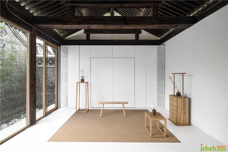 改變原本四合院的莊重、刻板的印象,營造開放、活躍的院落生活氛圍。別墅裝飾基于已有院落格局,利用起伏的地面連接室內(nèi)外高差并延伸至房屋內(nèi)部扭曲成為墻和頂,讓內(nèi)外空間產(chǎn)生新的動態(tài)關聯(lián)。隱于曲墻之內(nèi)的是廚房、衛(wèi)生間、庫房等必要的服務性空間;顯于曲墻之外的會客、餐飲空間與庭院連接成為一個整體。室內(nèi)外地面均采用灰磚鋪就,院中原有的一顆山楂樹也被保留在扭動的景觀之中。