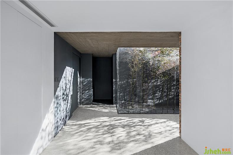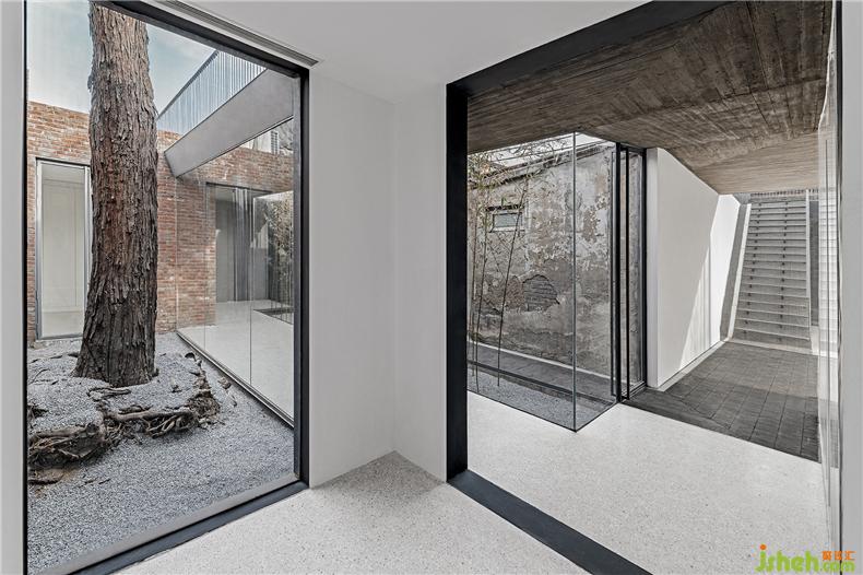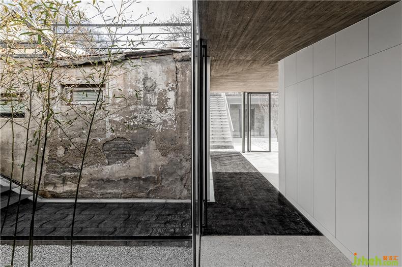 基于平屋頂建筑的特點,設(shè)計在舊有建筑平面格局上添加了連廊和樓梯,別墅裝飾將屋頂與地面、房屋與庭院相互串聯(lián),成為一條可通達(dá)賞玩的折疊循環(huán)路線,讓建筑的內(nèi)與外、上與下、新與舊產(chǎn)生互動關(guān)系。平屋頂是一處在四合院區(qū)域難得的公共活動場地,也是內(nèi)部功能使用的重要延伸,屋頂景觀與周邊復(fù)雜多樣的坡屋頂建筑和樹木形成有趣的對應(yīng)。別墅裝飾圍繞折疊的環(huán)線,由入口向內(nèi)部自然劃分出四個不同尺度的庭院——入口處狹長的竹院;保留原有老槐樹的樹院;清除原來玻璃頂,并置入水景、卵石的水院;以及保留南向與鄰里過渡的后院。因此,在這個空間游走將伴隨著不斷變化的景致。保留原有建筑的兩處磚房子,別墅裝飾并新增三處磚盒子則作為私密空間,功能分別被設(shè)定為休息室、廚房、衛(wèi)生間等。盒子之間構(gòu)成連續(xù)而又分離的公共區(qū)域,可容納辦公、聚會、餐飲等活動。磚盒子墻體內(nèi)部隱藏著屋面的結(jié)構(gòu),設(shè)計有意讓屋面與磚盒子墻面脫開產(chǎn)生天光的縫隙,令二者獨(dú)立并置。項目沿用了四合院常見的舊磚、青瓦、水泥等作為主要材料。屋面均為立砌青瓦鋪裝,青瓦按照屋頂不同方向線性排布,并跟隨樓梯連接到室內(nèi),產(chǎn)生如流水一般的視覺效果。別墅裝飾屋面為現(xiàn)澆混凝土板,室內(nèi)表面保留了木紋模板的自然紋理。磚盒子則是由附近院落拆除的舊磚砌筑的,由墻面延伸到屋頂并形成了休息座椅。