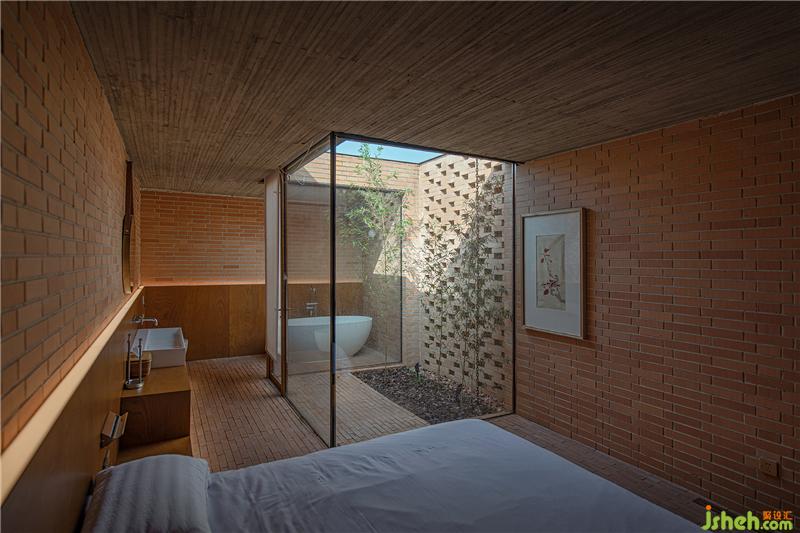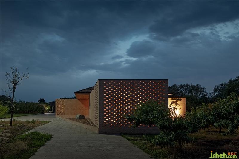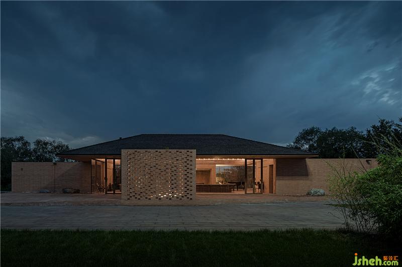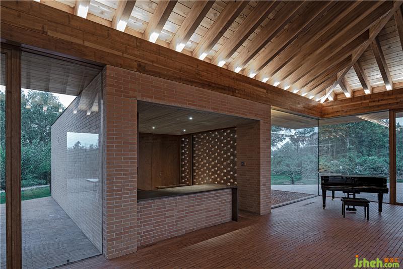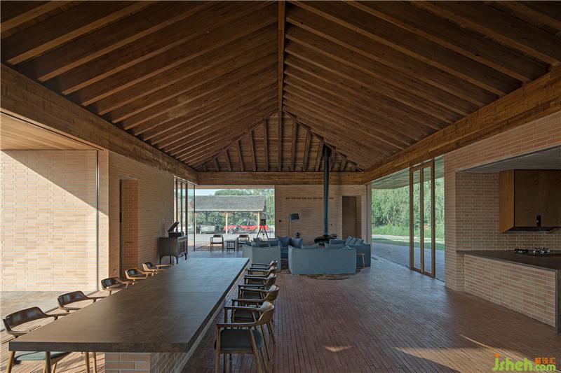 控制空間、結(jié)構(gòu)與材料的邏輯關(guān)系,圍繞鄉(xiāng)村休閑空間的基本特征,呈現(xiàn)物料的本真之美。四間房屋采用鋼框架+混凝土板,現(xiàn)澆木模板混凝土頂板直接顯現(xiàn)于室內(nèi)空間之內(nèi)。墻面使用了一種米黃色頁巖磚。設計利用雙層清水磚墻構(gòu)造,在墻內(nèi)空腔設有保溫層,保證熱工性能的同時,也保持了內(nèi)外一體的磚材料肌理和質(zhì)感,并隱藏結(jié)構(gòu)、空調(diào)等設備管線。唐山別墅裝飾墻面在庭院部分由實磚漸變?yōu)槁┐u,讓房屋內(nèi)外保持著光線和空氣上的流通。室內(nèi)外臺基地面也全部由米黃色磚鋪砌而成。公共空間屋頂采用了木結(jié)構(gòu)密肋梁,屋面覆蓋火燒板屋面瓦。木與磚材料的結(jié)合,共同營造出室內(nèi)空間樸素、溫暖、自然的氛圍,并且由壁爐、餐臺和鋼琴進一步定義了不同公共活動區(qū)域。
