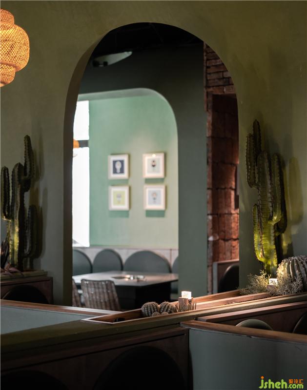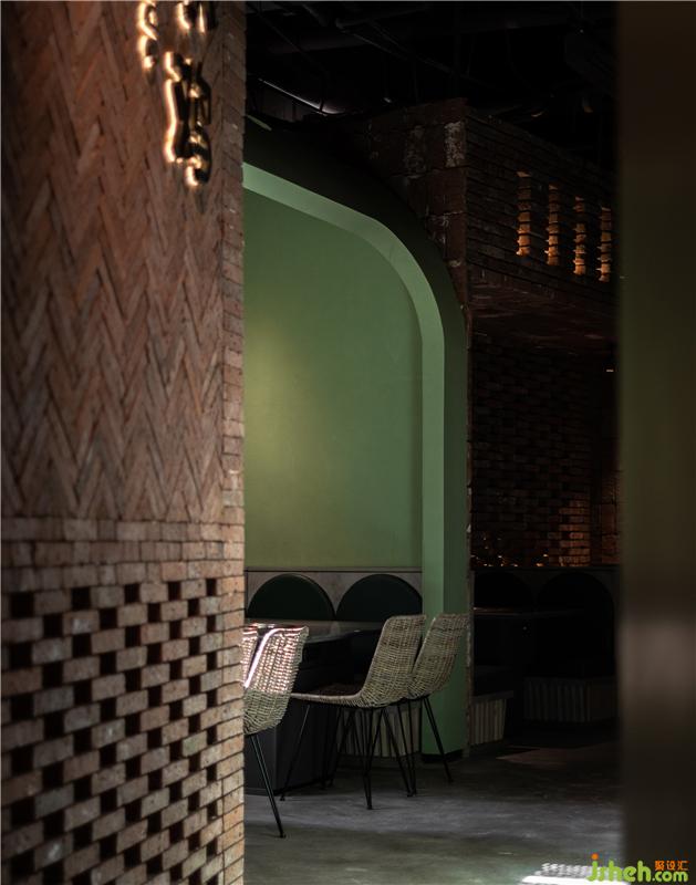 在灰綠色水泥的對(duì)立面,紅磚作為空間另一種主材,形成了有趣的色彩互補(bǔ)和質(zhì)感碰撞,設(shè)計(jì)師將這兩種美學(xué)元素并置在一起,前者體現(xiàn)優(yōu)雅格調(diào),后者則流露出文化沉淀后的底蘊(yùn),而兼顧生活感和藝術(shù)感,也是提升消費(fèi)者品味和凸顯品牌格調(diào)的一種方式。紅磚墻堆砌與拼接的設(shè)計(jì),不只是一道隔斷,傳統(tǒng)的工藝會(huì)賦予它力量感,光線也會(huì)隨著時(shí)間透出神秘的感覺(jué),在實(shí)虛交互之中,人們會(huì)從間隙中滲出詩(shī)意,粗狂但很浪漫。