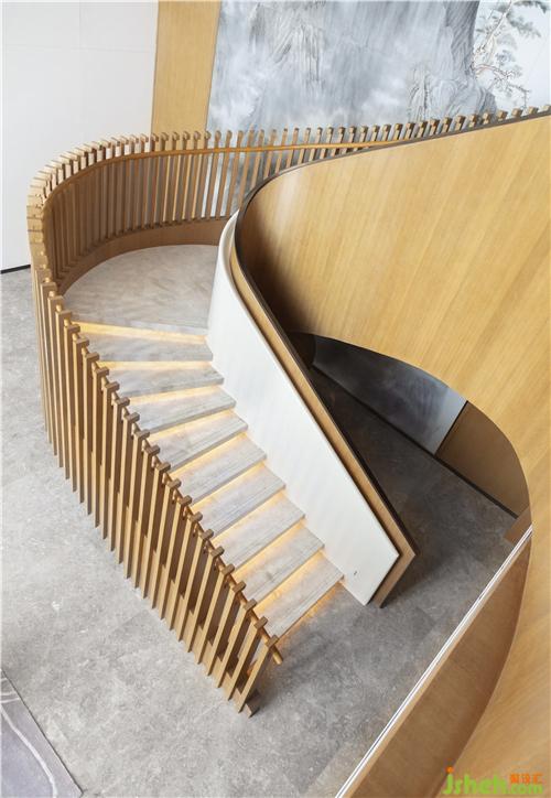客廳家具選用盧志榮經(jīng)典系列,高級(jí)米咖色系加上藍(lán)綠色藝術(shù)品點(diǎn)綴空間,讓空間簡(jiǎn)潔之余富有美學(xué)張力,旋轉(zhuǎn)樓梯利用石材和木飾面的碰撞用獨(dú)特的手法與工藝相結(jié)合加上起伏的琉璃鶴尾造型藝術(shù)裝置燈,展現(xiàn)出空間靈動(dòng)性和韻律感。背景巨幅山水墨畫彰顯東方韻味的藝術(shù)氣息,點(diǎn)亮整個(gè)空間,又不過(guò)分跳躍。