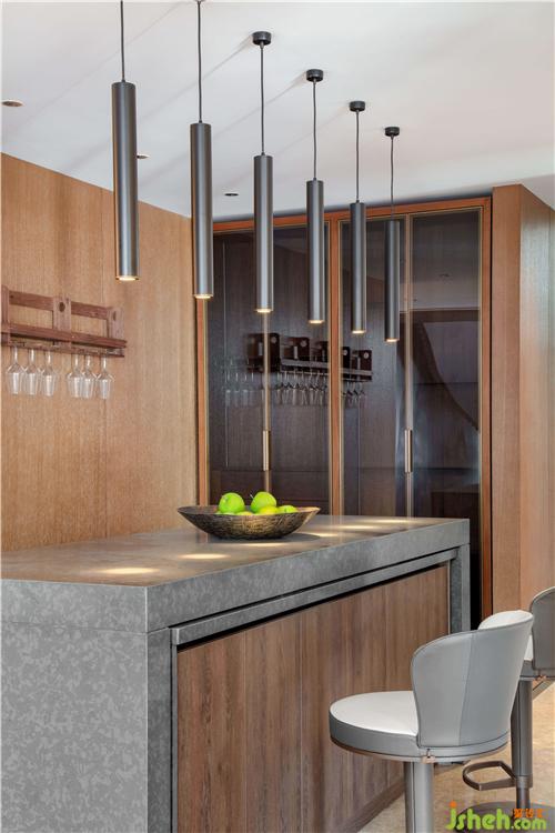 會(huì)客廳空間采用留白的手法, 靈感源自北宋范寬《溪山行旅圖》,主體大畫部分為巍峨高聳的山體,高山仰止,壯氣奪人,寓意寄情山水的寫意生活;挑高的空間帶來(lái)震撼的視覺(jué)感受,會(huì)客廳空間的頂部由細(xì)密的木條覆蓋了整個(gè)天花,體現(xiàn)出傳統(tǒng)的東方建筑風(fēng)格。暖灰調(diào)的石材、深啡色的木作和古銅材質(zhì)形成豐富的色彩和質(zhì)感。頂部垂落的琉璃鶴尾,仿若夏花般絢爛,讓氣氛變得熱烈,氣息變得歡快愉悅。別墅裝飾