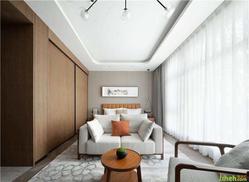 大面積采用了煙熏啞光鐵刀木飾面和素色硬包,簡(jiǎn)約大氣以及中式的留白。使主人在以后的生活閱歷中增添自己喜好的收藏和經(jīng)歷、別有一番情趣。主人房盡顯沉穩(wěn)大氣之勢(shì),整體木色淺灰的色調(diào),當(dāng)中以藍(lán)色為點(diǎn)綴,彰顯干練的同時(shí),又不失寧?kù)o的氛圍,讓主人在繁忙的工作中能夠享受生活。
