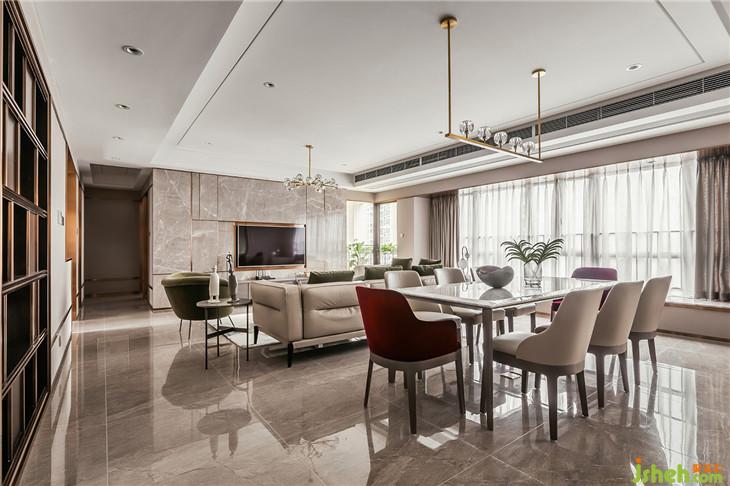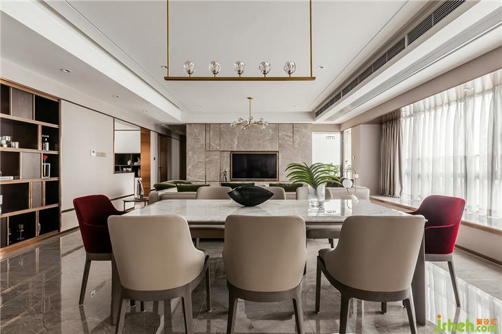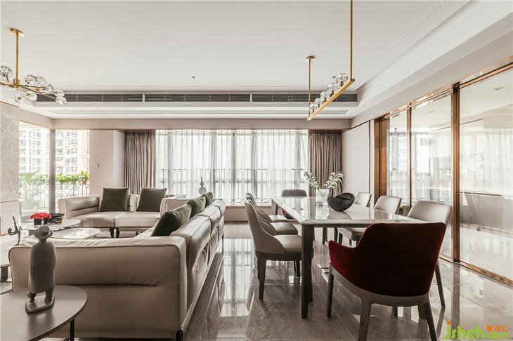 原始戶(hù)型優(yōu)點(diǎn)和缺點(diǎn)同樣明顯,客廳餐廳不分區(qū)視野大,四面開(kāi)窗開(kāi)門(mén)采光好,但每面墻都不對(duì)稱(chēng)且不完整。硬裝設(shè)計(jì)以電視墻與吊頂為中心建立中軸對(duì)稱(chēng)關(guān)系,以金屬裝飾線條建立延伸圍合關(guān)系,取消小陽(yáng)臺(tái)擴(kuò)大廚房空間,全房?jī)H保留兩個(gè)臥室套間和一個(gè)客房兼儲(chǔ)物室。圍繞男主人的喜好和女主人的需求,空間設(shè)計(jì)緊扣現(xiàn)代簡(jiǎn)約+雅奢時(shí)尚的調(diào)性進(jìn)行多向發(fā)揮,整體搭配以米金咖作為主基調(diào),背景色基本為米咖色,陳設(shè)主色較之更深濁一層,配色加入不同色相的紅與綠,點(diǎn)綴黑白灰平衡視覺(jué)。