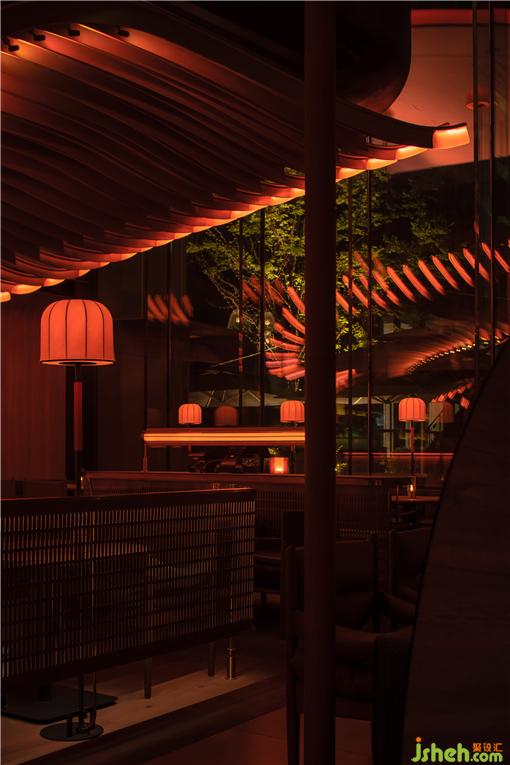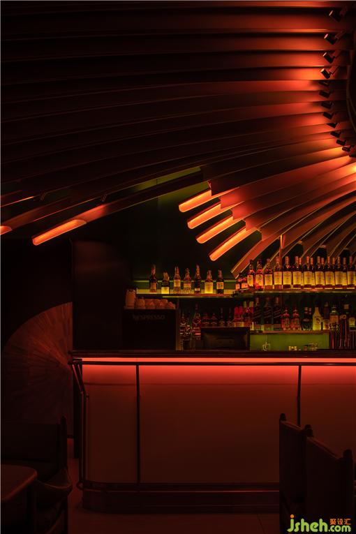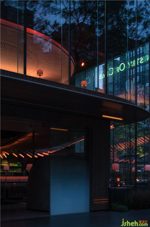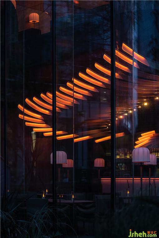 一層的酒吧是著重構(gòu)想的區(qū)域,我們希望這里是一個可以放飛自我,潮流匯聚的地方,同時,也希望能在整個交子大道上出現(xiàn)一個特別又便于記憶的元素。我們將大天使之翼設(shè)計進來,并將整個二層樓板托起,餐廳設(shè)計使其成為整個空間里內(nèi)外視覺的焦點,并通過特別設(shè)計的照明方式,讓整個翅膀如驚鴻般閃動變化,酒吧的多元變幻和張力將更加明顯。