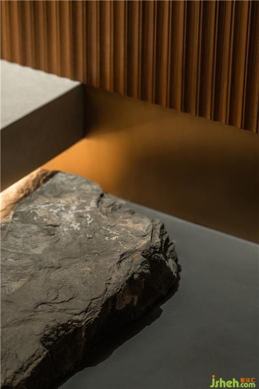 遠(yuǎn)遠(yuǎn)看去,整個空間如同嬰兒在母親子宮中孕育,展廳設(shè)計在被自然頑石點(diǎn)綴后、植物柔曼地界定著空間的邊際,呈現(xiàn)出恬淡、靜謐、充滿溫情的情態(tài)。