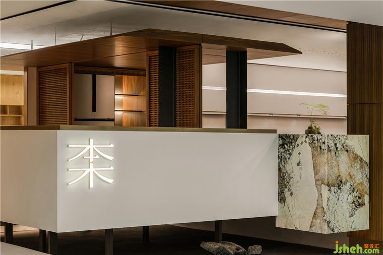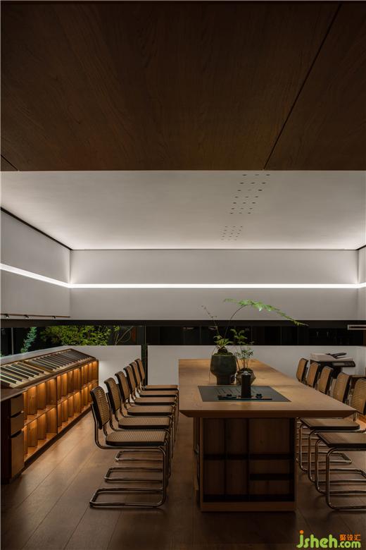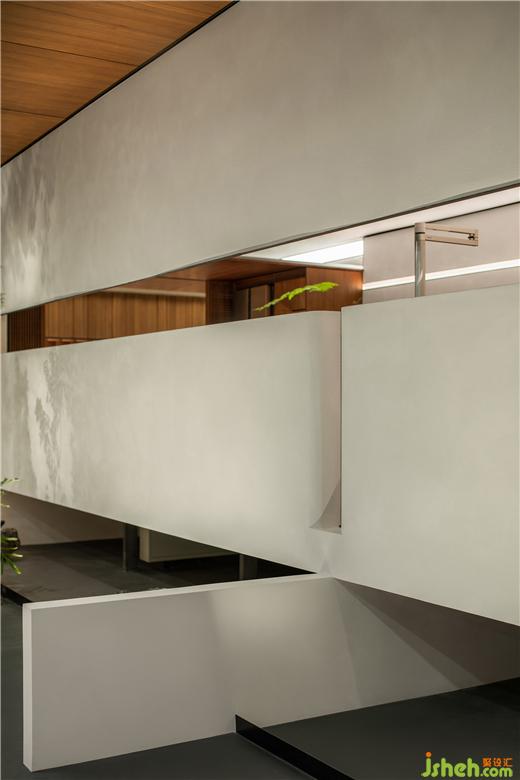 在這里,展廳設計師恰如其分地引入室內(nèi)園林的元素,點綴的頑石在架空層邊緣,與植物枝影成為界定空間邊緣的元素,生氣怡然。橫貫盒子中上部的長窗的高度被設計師精心設計,成為視線遮蔽與開啟的重點。這樣,接待與方案討論被共享和自然分區(qū),互為可交流的風景。