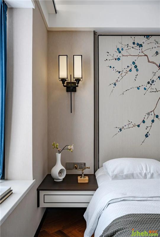 龍巖私宅設計主臥延續(xù)客廳的素雅靜謐,卻一改水墨意境,樹枝上的嬉鬧的燕雀,帶回春天的洋洋暖意與靈動的氛圍,也寓意著“比翼雙飛”的美好祝愿。