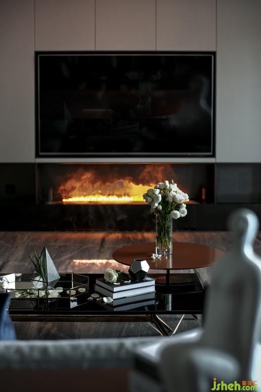 轉(zhuǎn)眼側(cè)望,便是電視背景墻,設(shè)計(jì)上將美觀藝術(shù)與實(shí)用功能完美結(jié)合——左右柜面是隱藏式儲(chǔ)物柜,下嵌黑色壁爐,寓意生生不息;整體墻面以黑白相襯,經(jīng)典永恒,且充滿現(xiàn)代感。