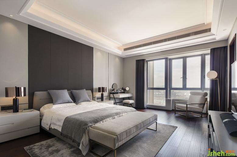 主臥依然以灰色為基調,搭配木質地板和白色墻面、家具、暖色燈系,渲染出溫和雅致的空間氛圍。日出而起,星月升而眠,一切如同房間的擺置、設計,都恰到好處。